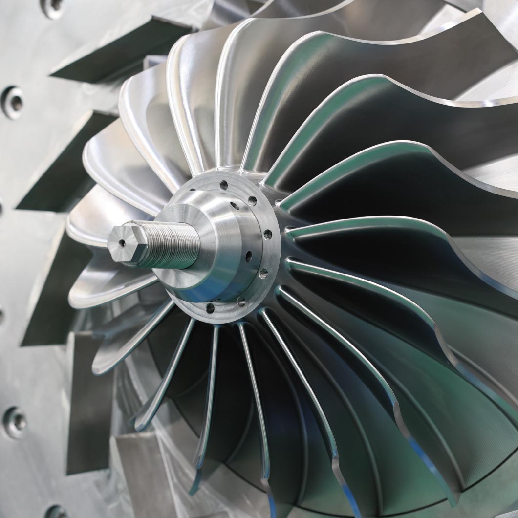 叶轮材质是由高强度、耐磨、高耐腐蚀的钛合金材料锻造,并通过五轴联动铣床精铣而成。